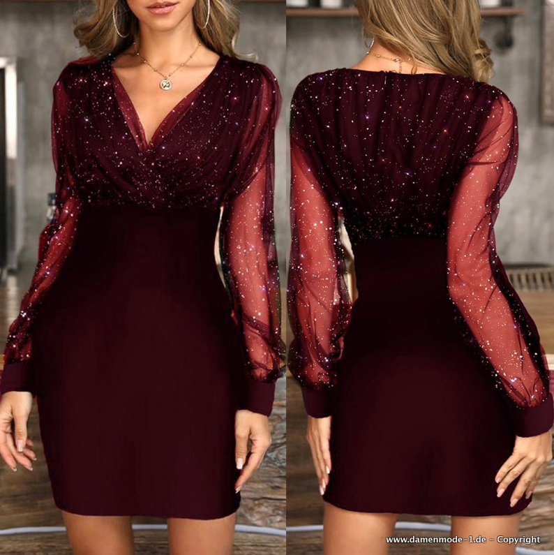 Sexy Pailletten Bleistift Kleid mit Tüll Ärmel in Weinrot