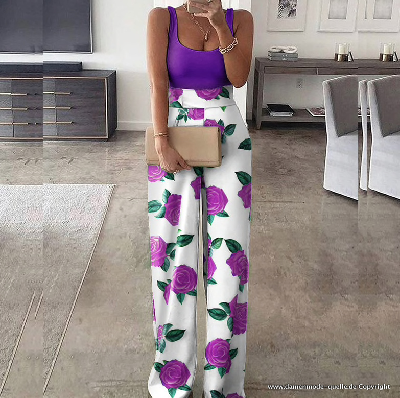 Sommer Jumpsuit Overall Einteiler Elegant in Lila Weiß mit Blumen