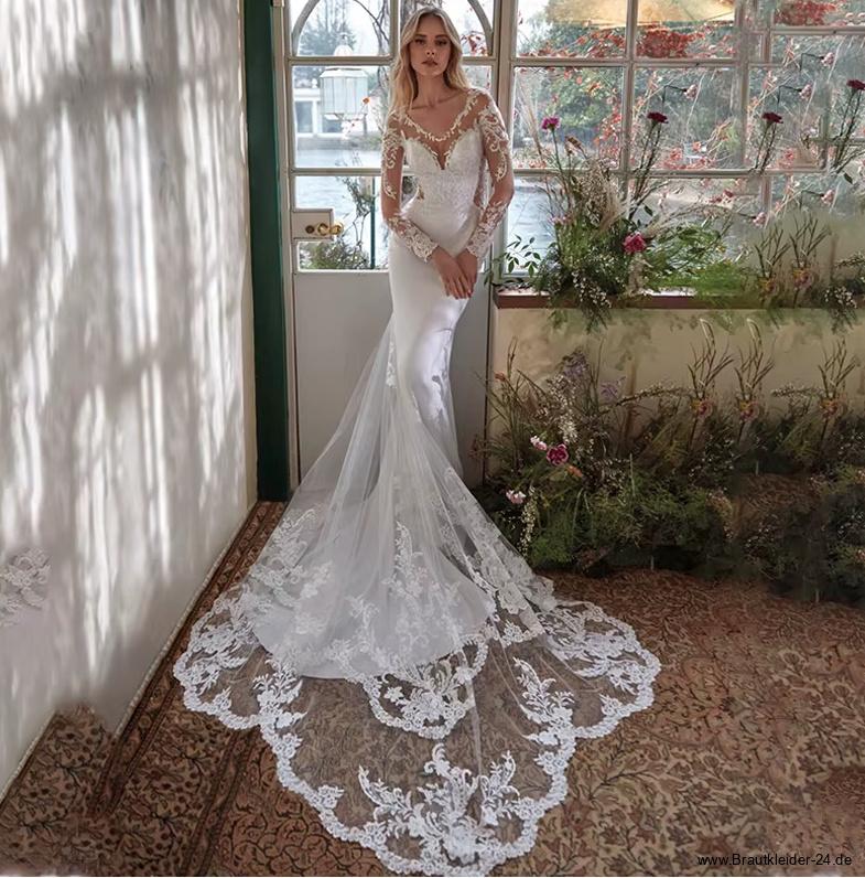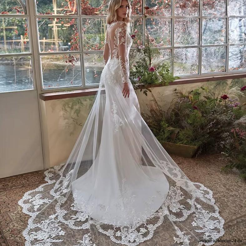 2 in 1 Fit and Flare Brautkleid Eilika mit Ärmeln aus Spitze Schleppe Abnehmbar