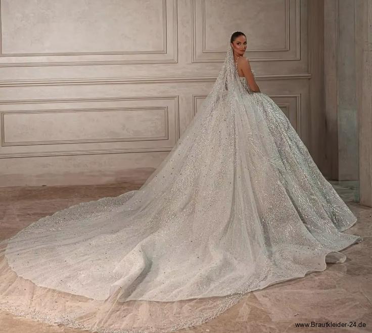 Luxus Perlen Pailletten Glitzer Brautkleid Emanuele mit Spaghettiträger und Schleppe