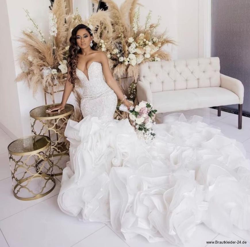 Schulterfreies Meerjungfrau Brautkleid Elenor mit Perlen Applikationen und Rüschen Schleppe