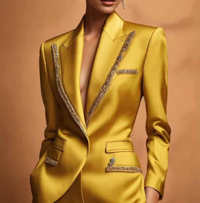 Festive satin pantsuit „Peace“ in yellow with appliqués
