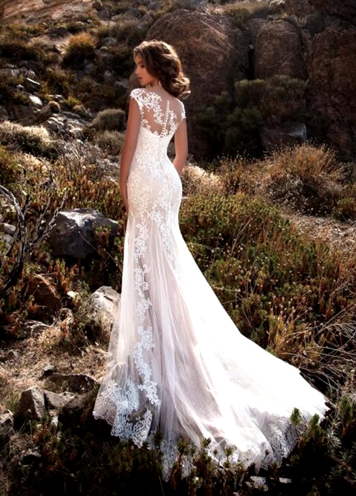 Modern fit and flare wedding dress Carmina with floral lace and train