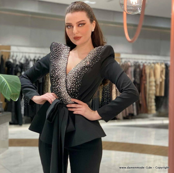 Eleganter Hosenanzug in Schwarz für Damen mit Perlen Bestickt