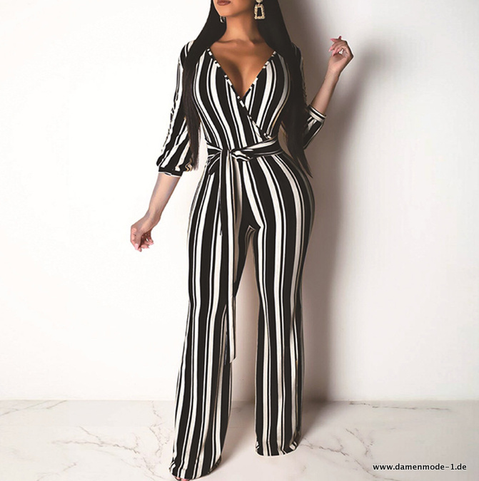 Langarm V Ausschnitt Onepice Jumpsuit Schwarz Weiß Gestreift
