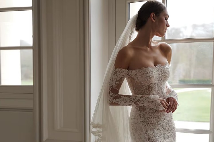 Off-the-shoulder long-sleeved wedding dress Ileana made of lace with a train