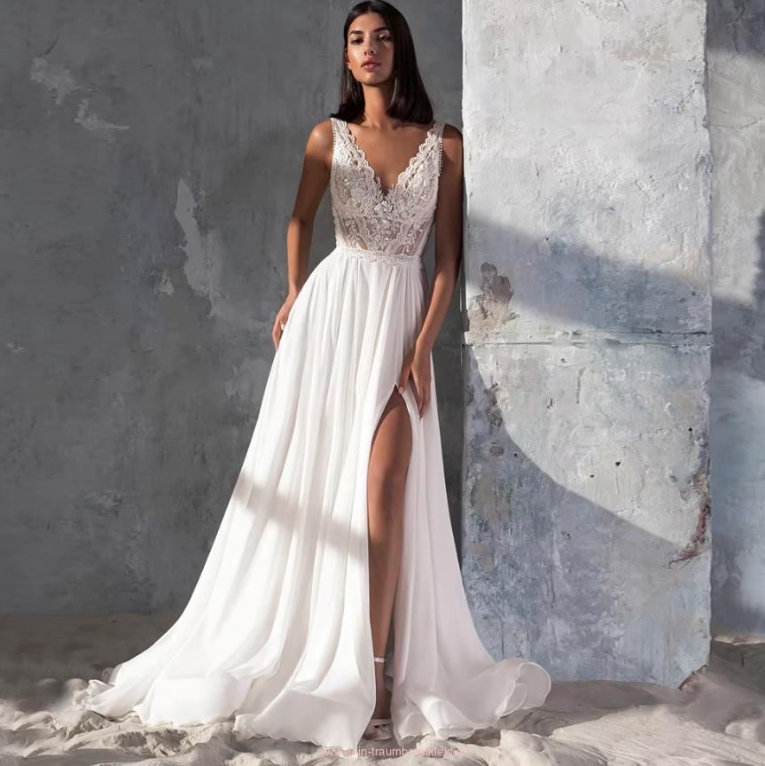 Sleeveless A-line wedding dress Enna with lingerie-style top, lace and sequins