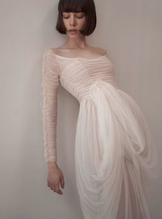 Romantic long-sleeved tulle wedding dress Chalyse with round neckline