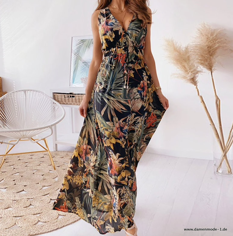 Vintage Print Maxi Sommerkleid Lang Schwarz
