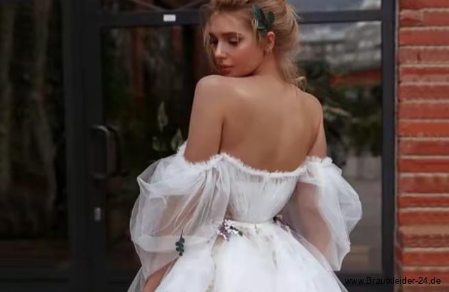 Schulterfreies Chiffon Brautkleid Fay Kurz mit Blumen Applikationen