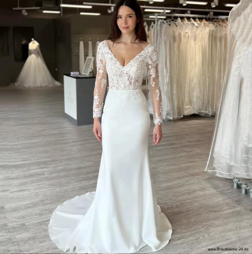 V Ausschnitt I Linie Brautkleid Friderun mit Ärmeln aus Spitze und Schleppe