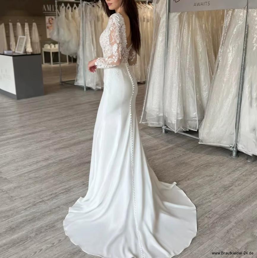 V-neck I-line wedding dress Friderun with lace sleeves and train