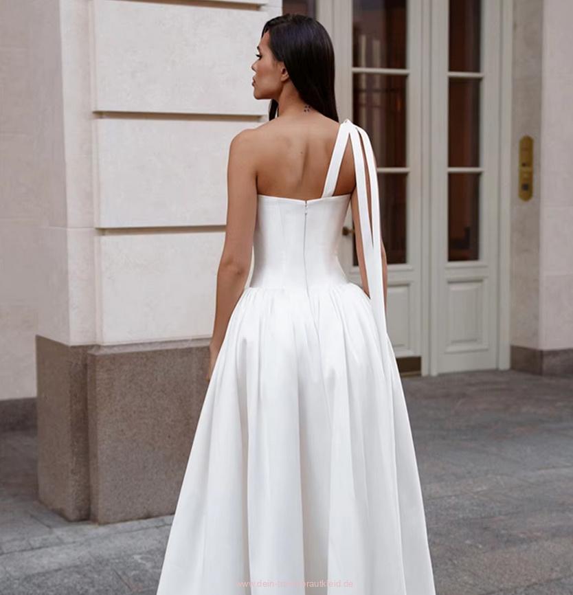 A-line, one-shoulder wedding dress Cettina, ankle-length with large flower