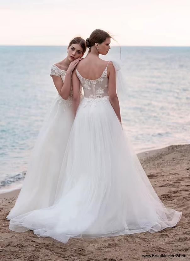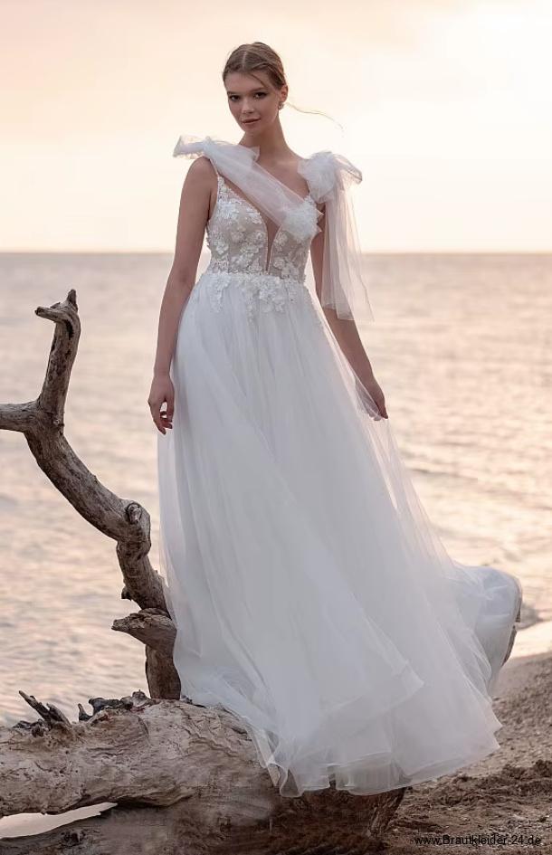 A Linie Tüll Brautkleid Floria mit V Ausschnitt und Blumen Applikationen