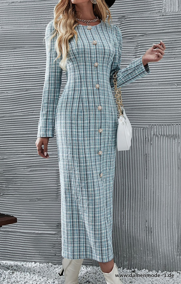 Langarm Tweed Kleid Elegant in Hellblau Knöchellang