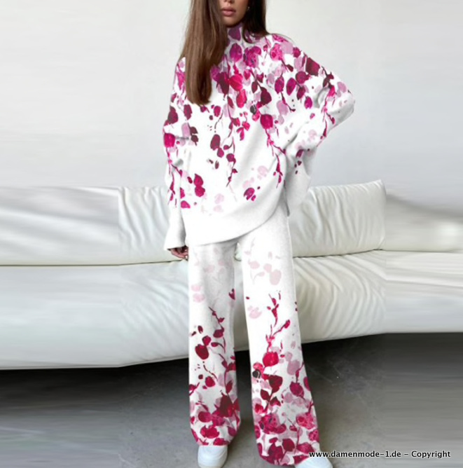 Damenoutfit Zweiteiler Hausanzug in Weiß mit Blumen