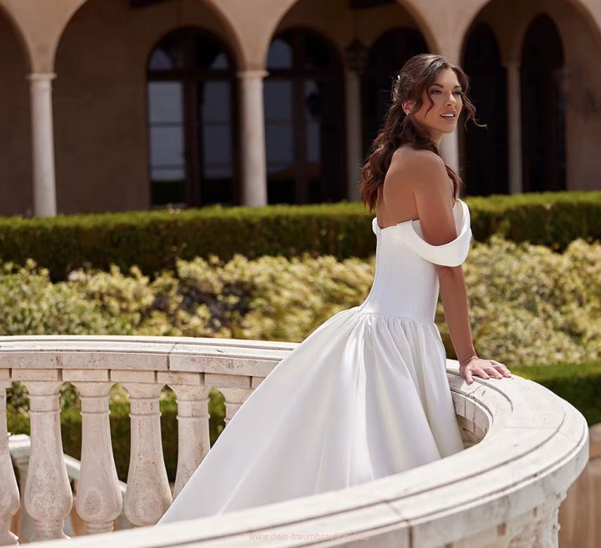 Schulterfreies A Linie Clean Chic Brautkleid Floria mit Schleppe