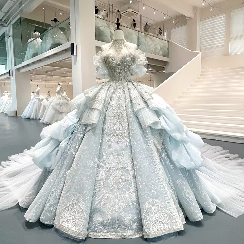 Luxury queen wedding dress cami with pearls, sequin embroidery and a 2M train