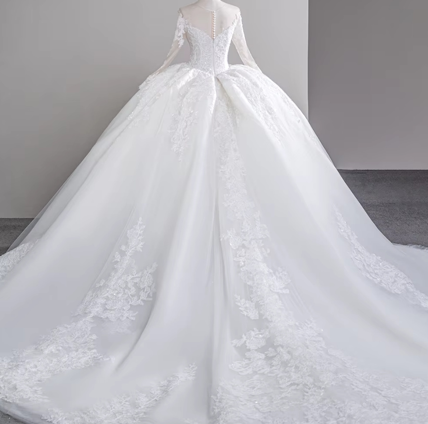 Luxury long-sleeved princess wedding dress Carry with pearl and sequin appliqués
