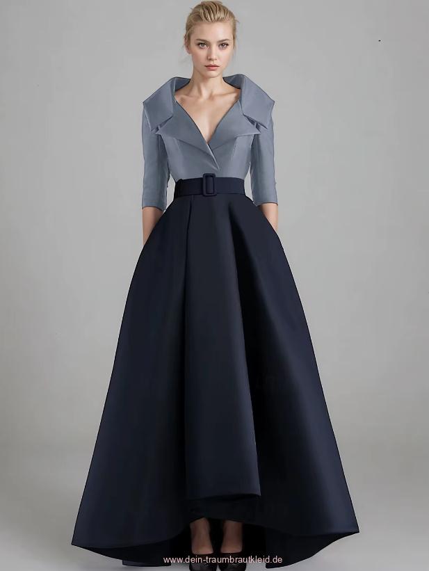 A Linie Satin Kleid Franka Elegant für Hochzeitsgäste in Marine Blau Silber mit V Ausschnitt