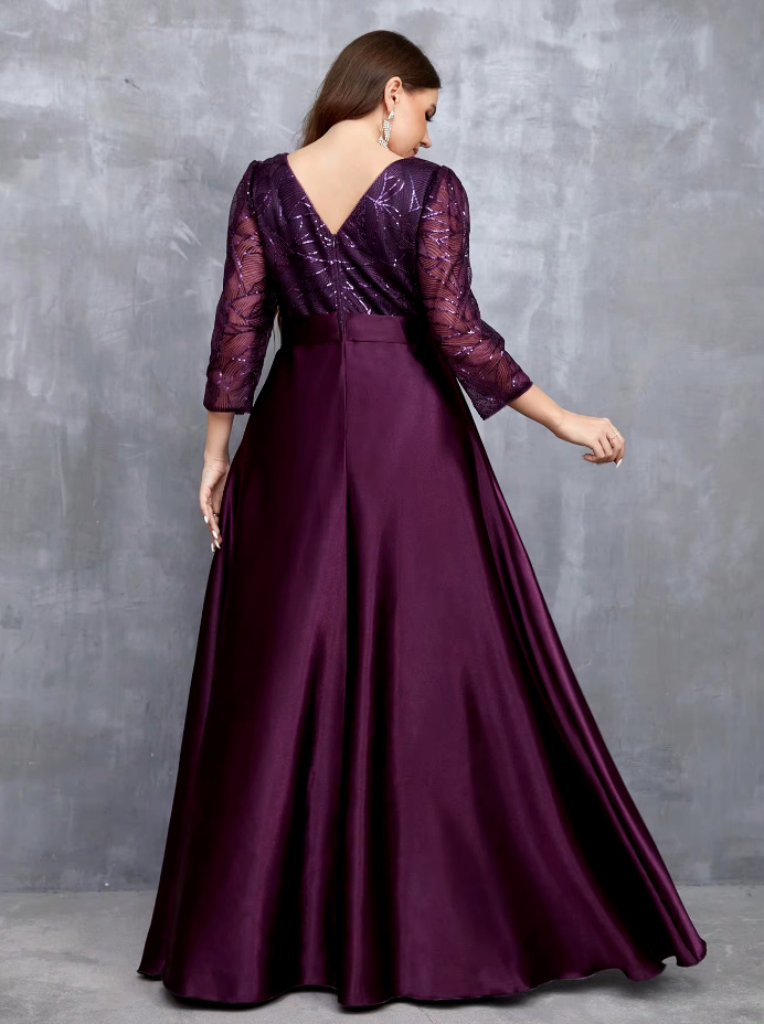 Elegant A-line long-sleeved maxi dress for wedding guests in purple with a round neckline