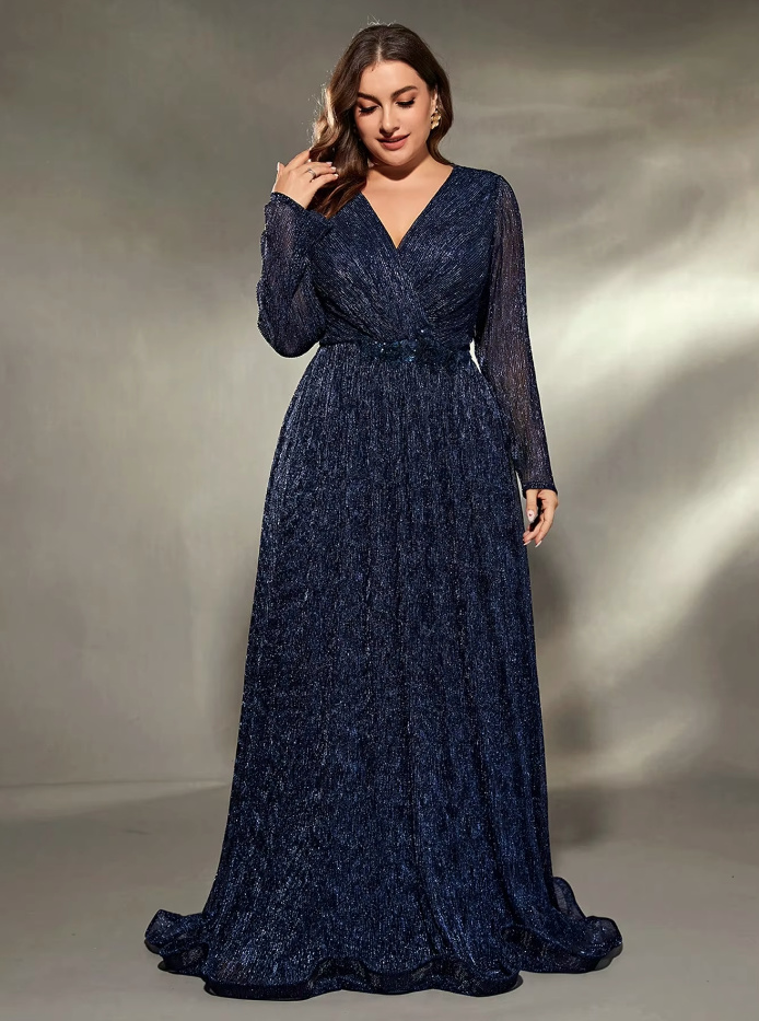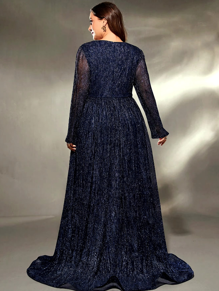 Elegant A-line long-sleeved maxi dress for wedding guests in navy blue with a V-neck