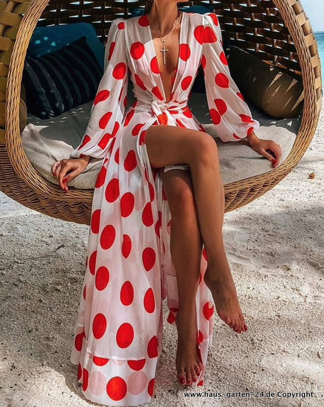Damen Chiffon Sommerkleid Strandkleid in Weiß Gepunktet