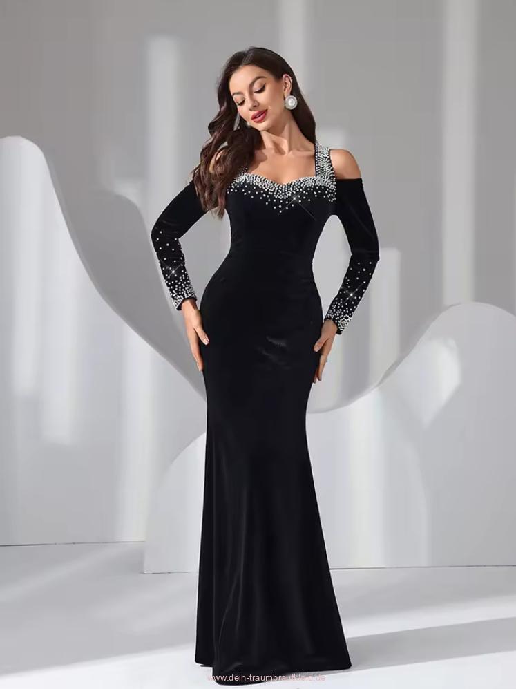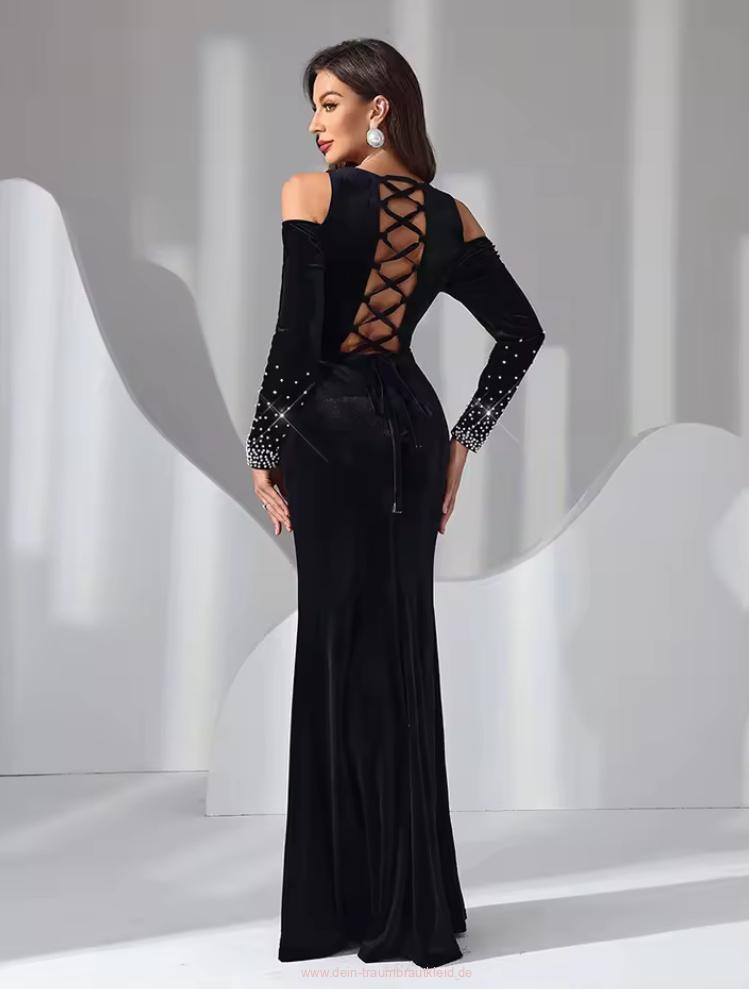 Langarm Fit and Flare Kleid Elegant für Hochzeitsgäste in Schwarz mit Cut Out Schulter