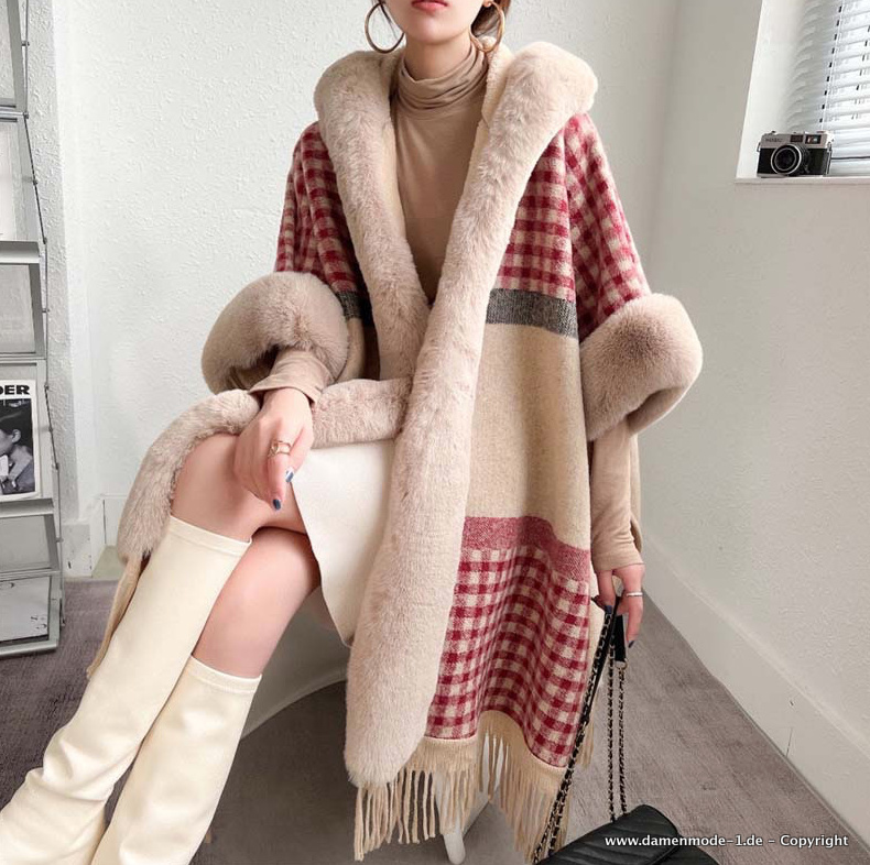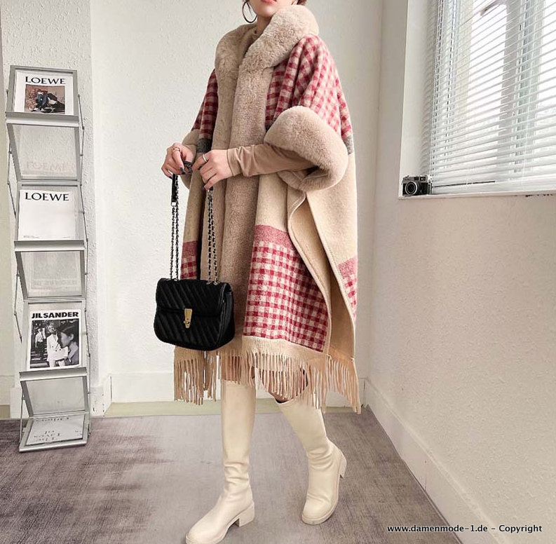 Patchwork Damen Jacke Poncho mit Kapuze und Kunstpelzkragen