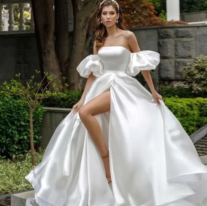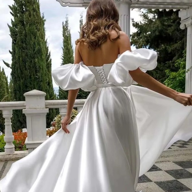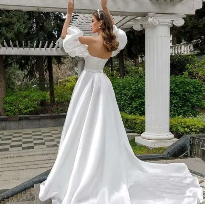 Empire satin wedding dress Imke, floor-length with puff sleeves and train