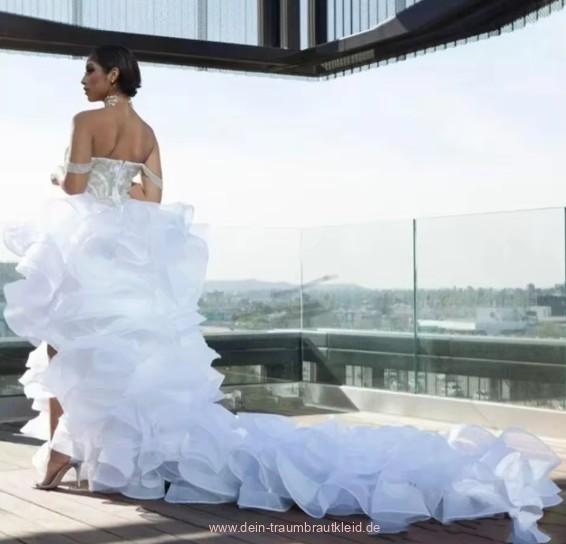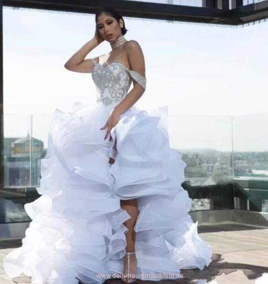Schulterfreies Rüschen Brautkleid mit Schlitz und Schleppe