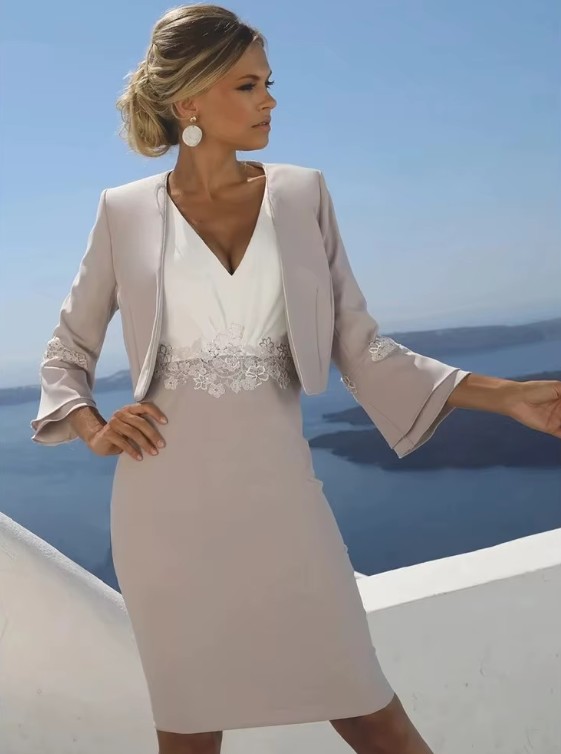 Elegant midi pencil dress for wedding guests with bolero jacket