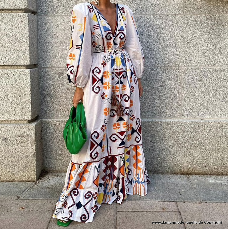 A Linie Maxi Sommerkleid mit V Ausschnitt und Retro Muster Lang