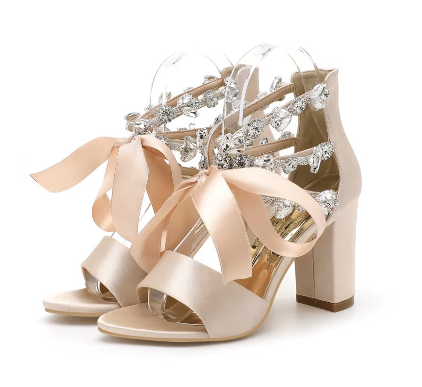 Satin crystal bridal sandals, wedding shoes in gold