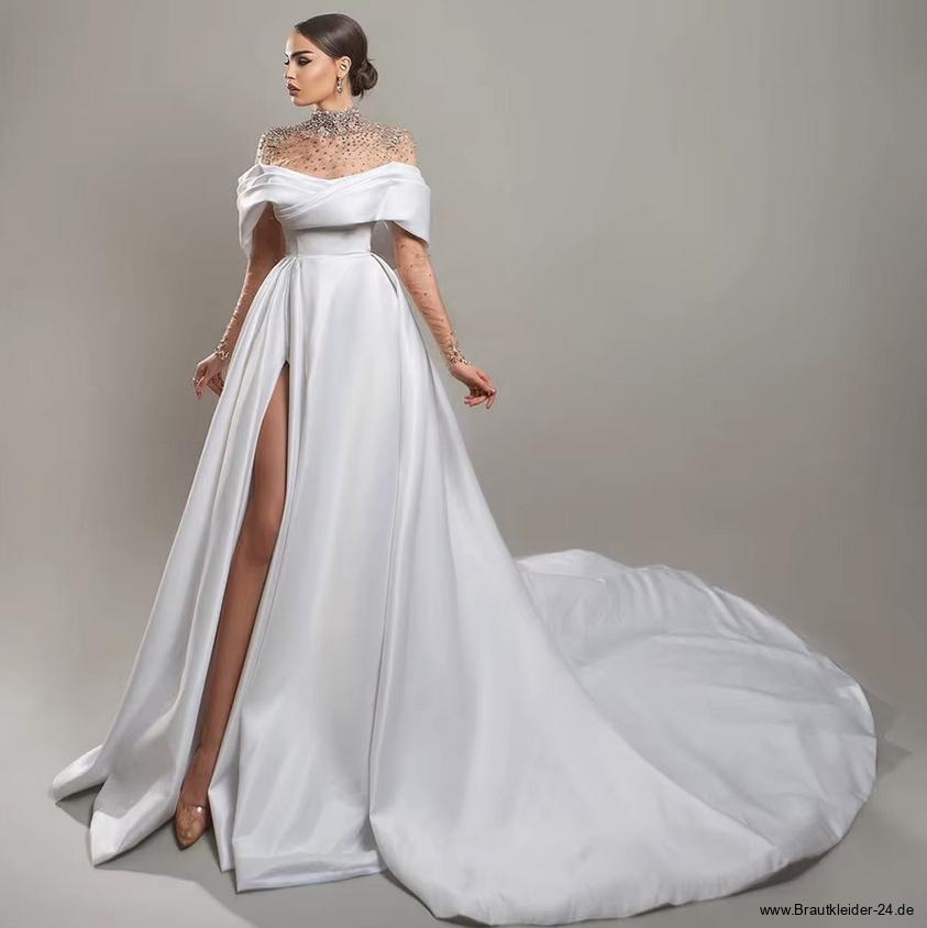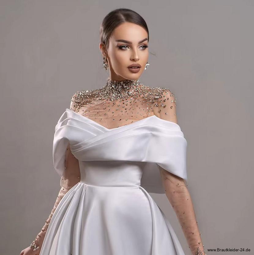 A Linie Satin Brautkleid Fina mit Illusion Ausschnitt Strass und Schleppe