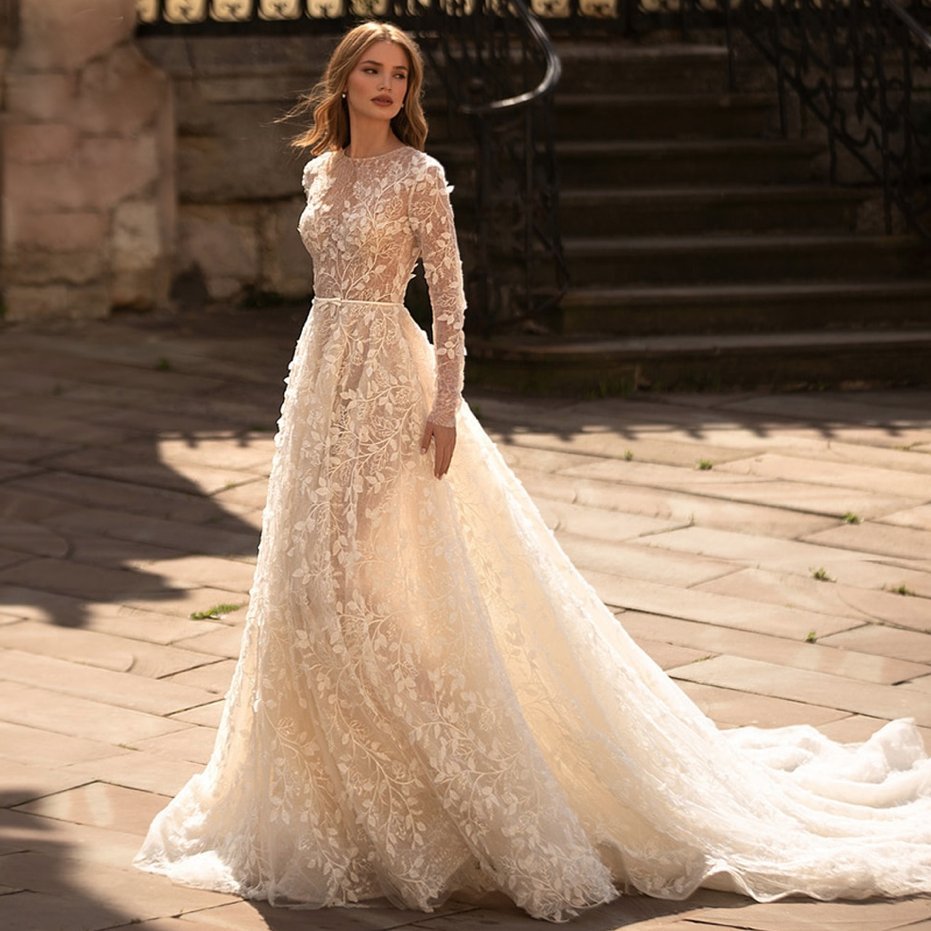 A-line boho wedding dress Annbritt, long sleeves with lace and train