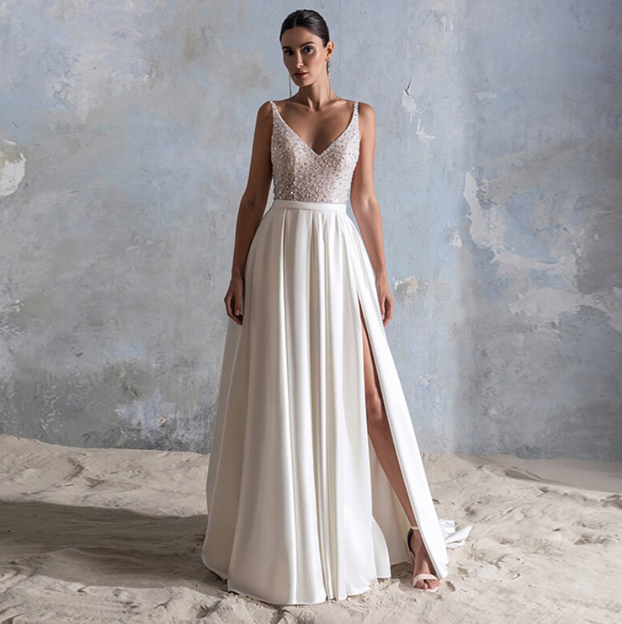 A-line patchwork wedding dress Aleya with V-neck and sequin embroidery
