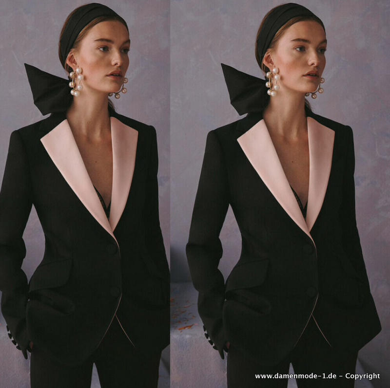 Business Hosenanzug Elegant in Schwarz Mit Reverskragen in Altrosa