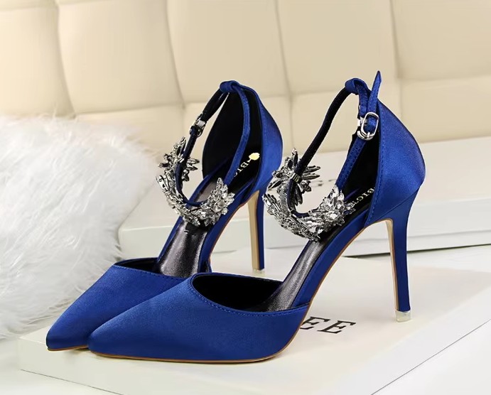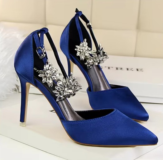 High Heels Stiletto Satin Brautschuhe Inga in Blau mit Strass Applikationen
