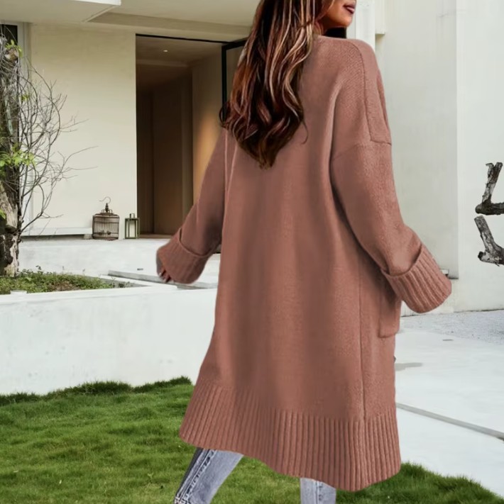 Lange Damen Strickjacke Gabriele mit Taschen in Caramel