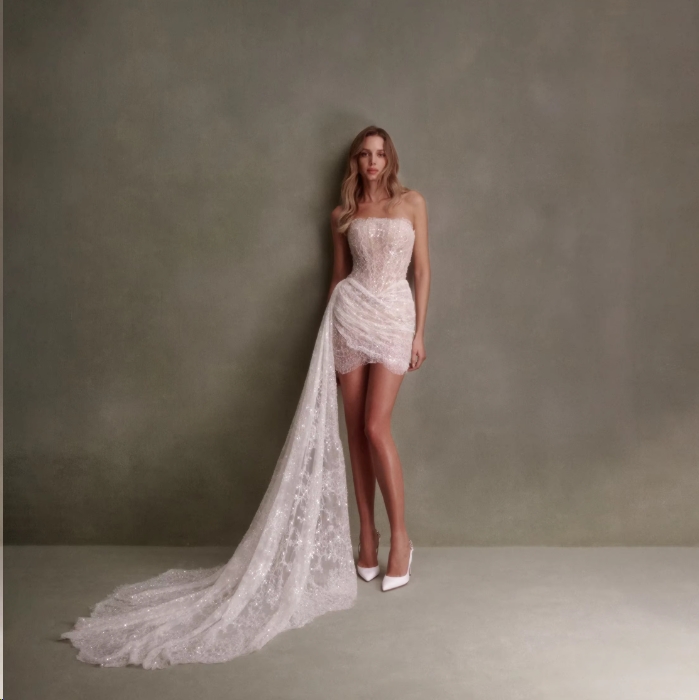 Schulterfreies Mini Glitzer Etui Brautkleid Iolanthe mit Schärpe