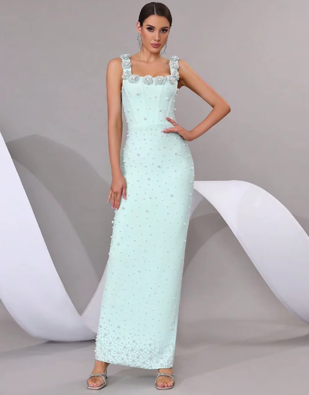 Sleeveless sheath wedding dress Iolana in light green with flowers and pearl appliqués