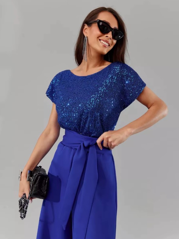 A-line jumpsuit Gaby with glitter top in dark blue. Elegant and festive.