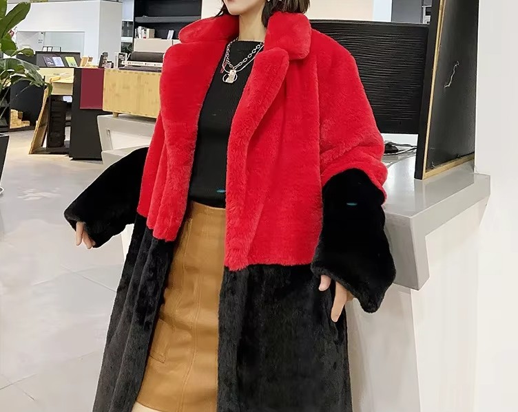 Long women’s plush coat in contrasting colors black and red