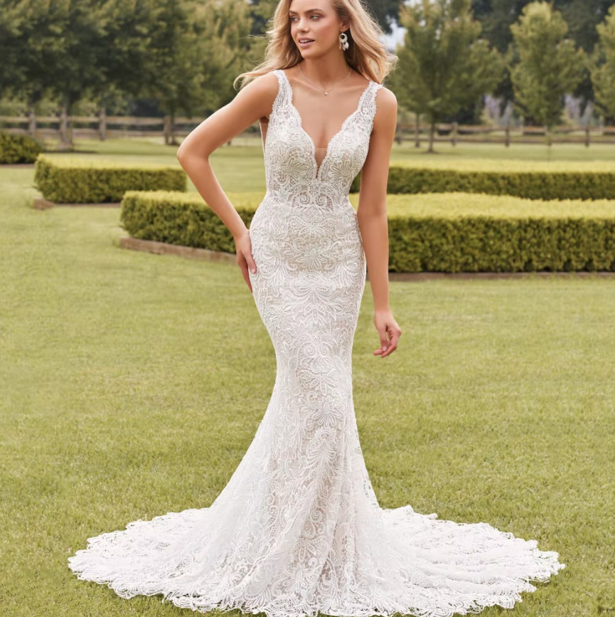 Mermaid wedding dress Camellia made of lace, sleeveless with V-neck and train