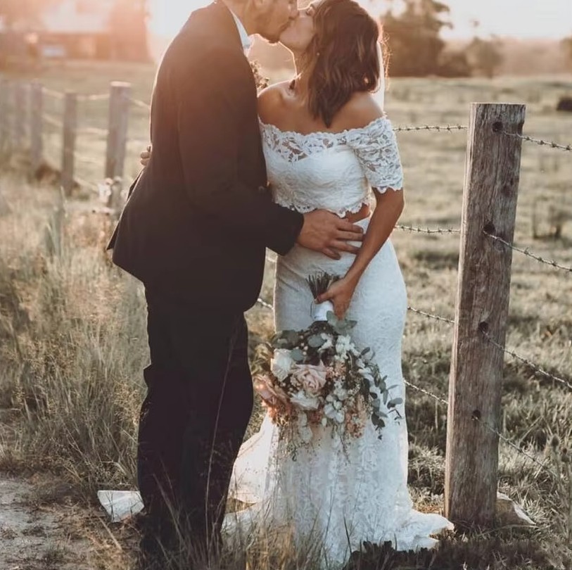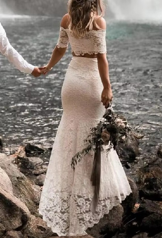 Off-the-shoulder fit and flare wedding dress Irmtraud, two-piece in lace