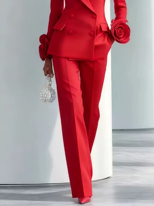 Women’s red trouser suit, elegant and festive with 3D flowers