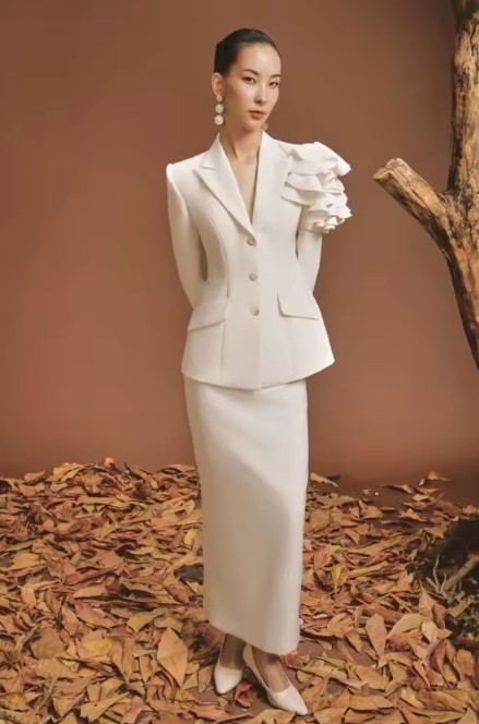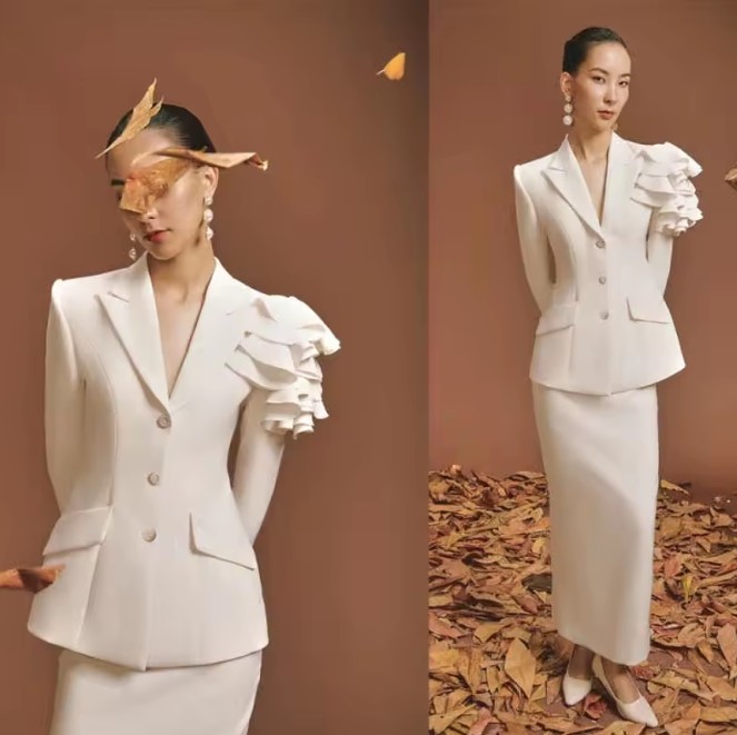 Elegantes Etui Damen Kostüm Lang in Weiß mit Rüschen