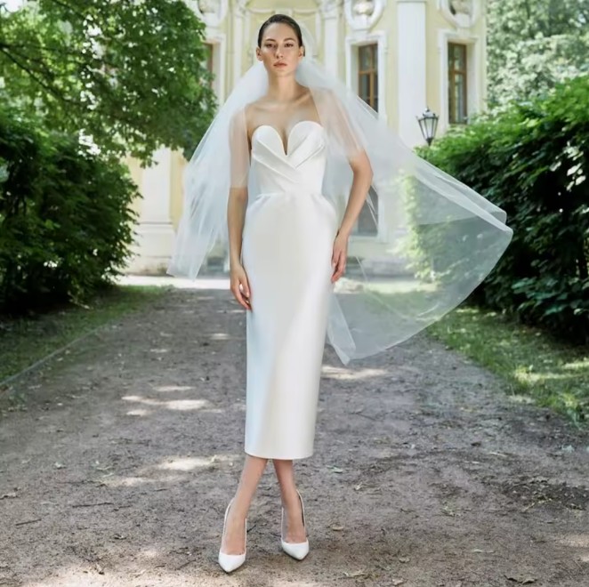 Off-the-shoulder I-line wedding dress Iolana, calf-length