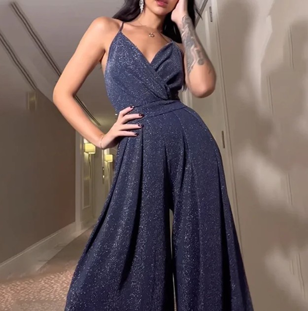 A-line glitter chiffon jumpsuit by Gail Lang in dark blue
